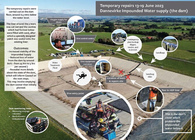 In mid-May, inspection with a remotely operated vehicle (an underwater drone) found two leaks in the impounded supply liner. These were located at the base of the western embankment of the dam wall and required repairs to manage the risk of dam failure and/or disruption to Dannevirke’s water supply.
