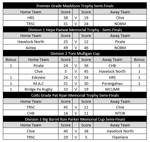In Division 2 Central beat Clive 36-24, Porangahau lost to MAC 31-30, with Bridge Pa beating Waipawa Country United, 33-19.