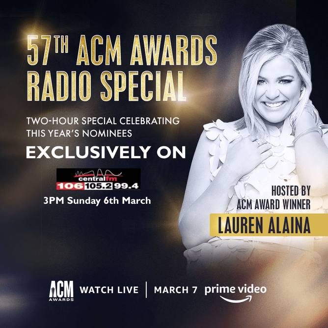 The 57th ACM Awards 2–hour radio special leading up to the big televised awards show will be heard between Friday 25th February and Sunday 6th March, exclusively on the following regional and local independent stations across the nation. Catch it on Central FM Sunday 6th March from 3pm- 106.0FM, 105.2FM & 99.4FM and IHeart radio