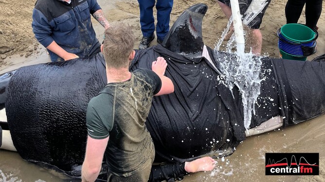 A trench was dug to the sea and teams used hoses to keep the remaining orca wet, with the juvenile successfully refloated at about six o’clock Saturday night.